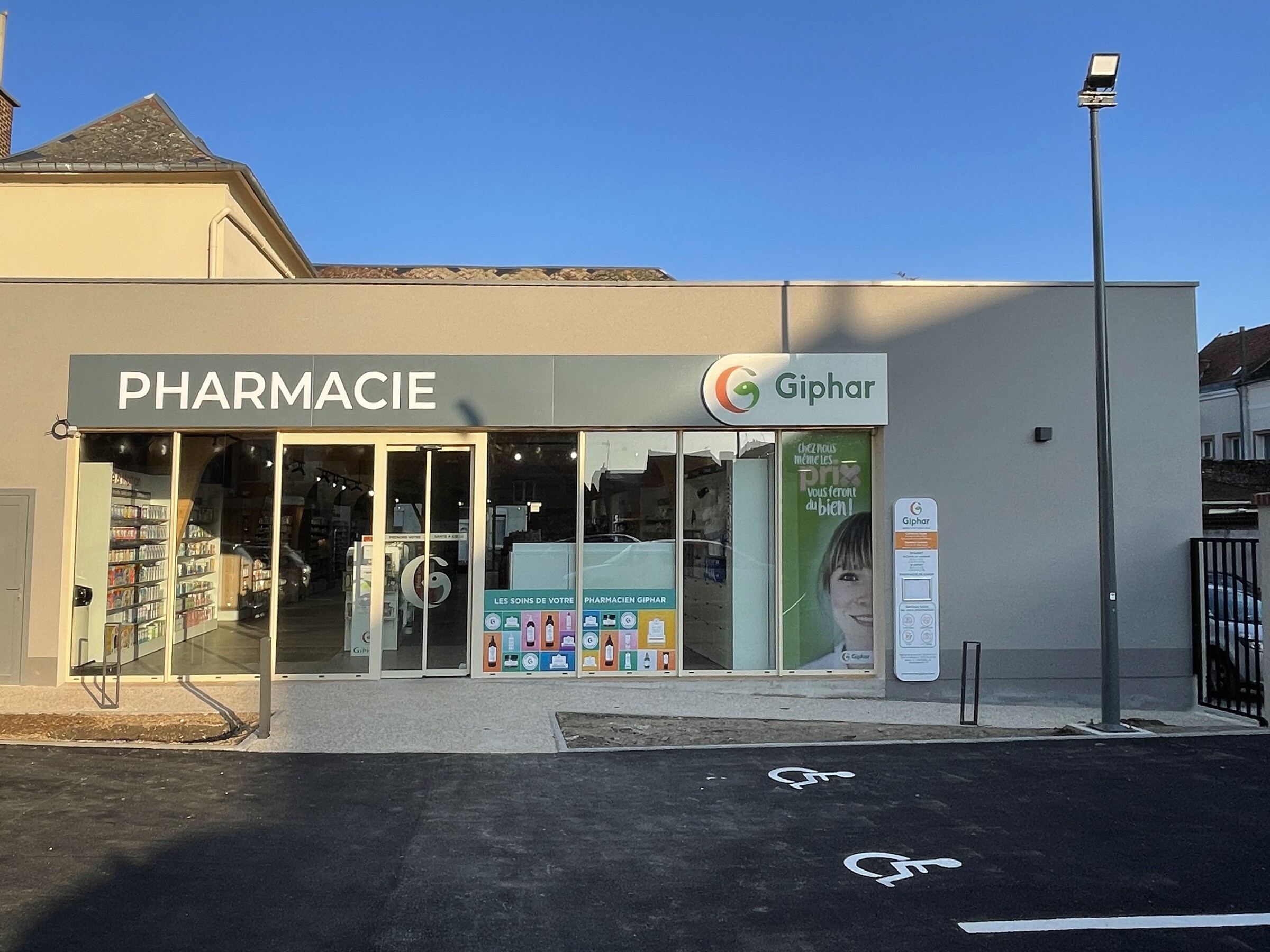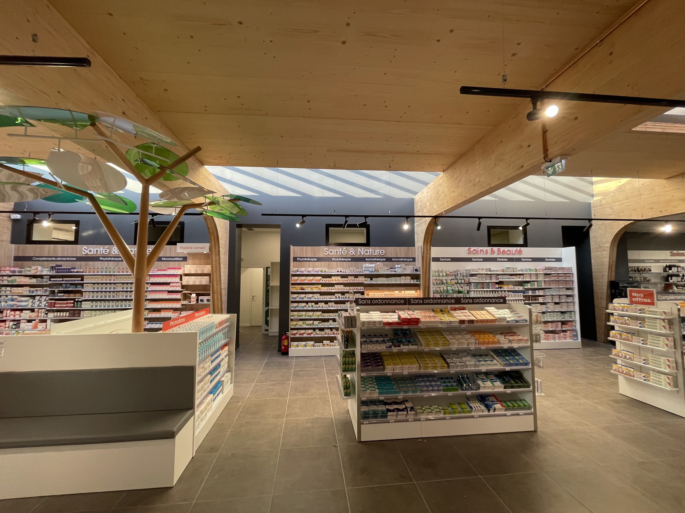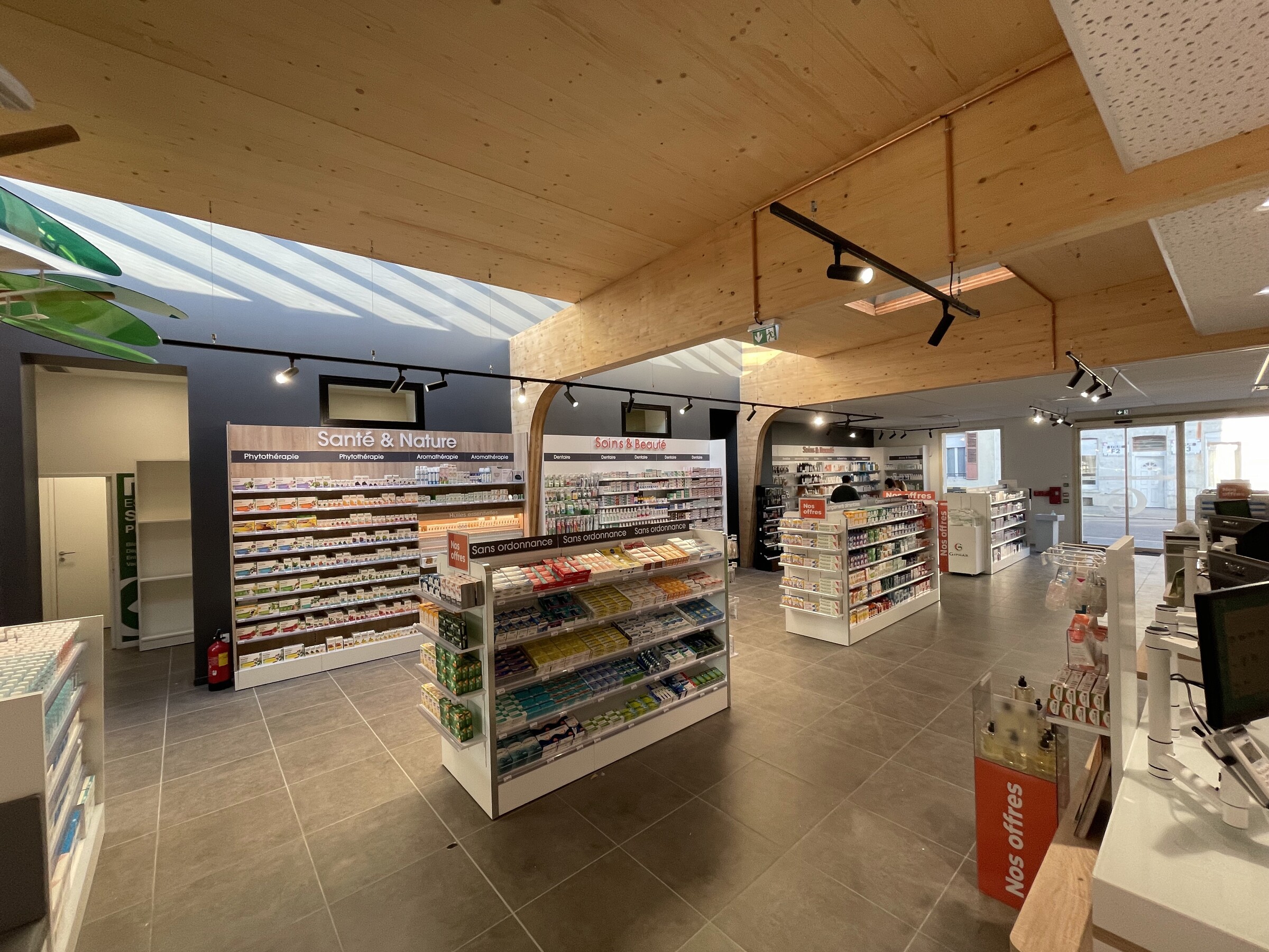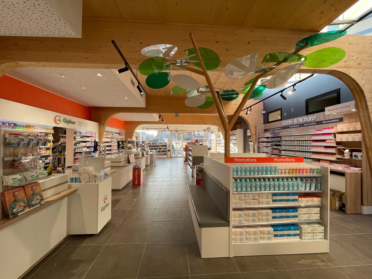 Ce projet consiste en la fusion de deux pharmacies au sein d’une même ville, Bohain en Vermandois (02). Ce projet s’implante dans un bâtiment existant du XXème siècle qui a fait l’objet de plusieurs usages différents au fil des années. La parcelle était parsemée de petites constructions éparses sur la parcelle. La bâtiment principal a été conservé et a fait l’objet d’une rénovation complète, et une extension en bois massif apparent a été créée en prolongement du bâtiment existant. Les portiques structurels en bois apparent donnent un rythme à l’espace