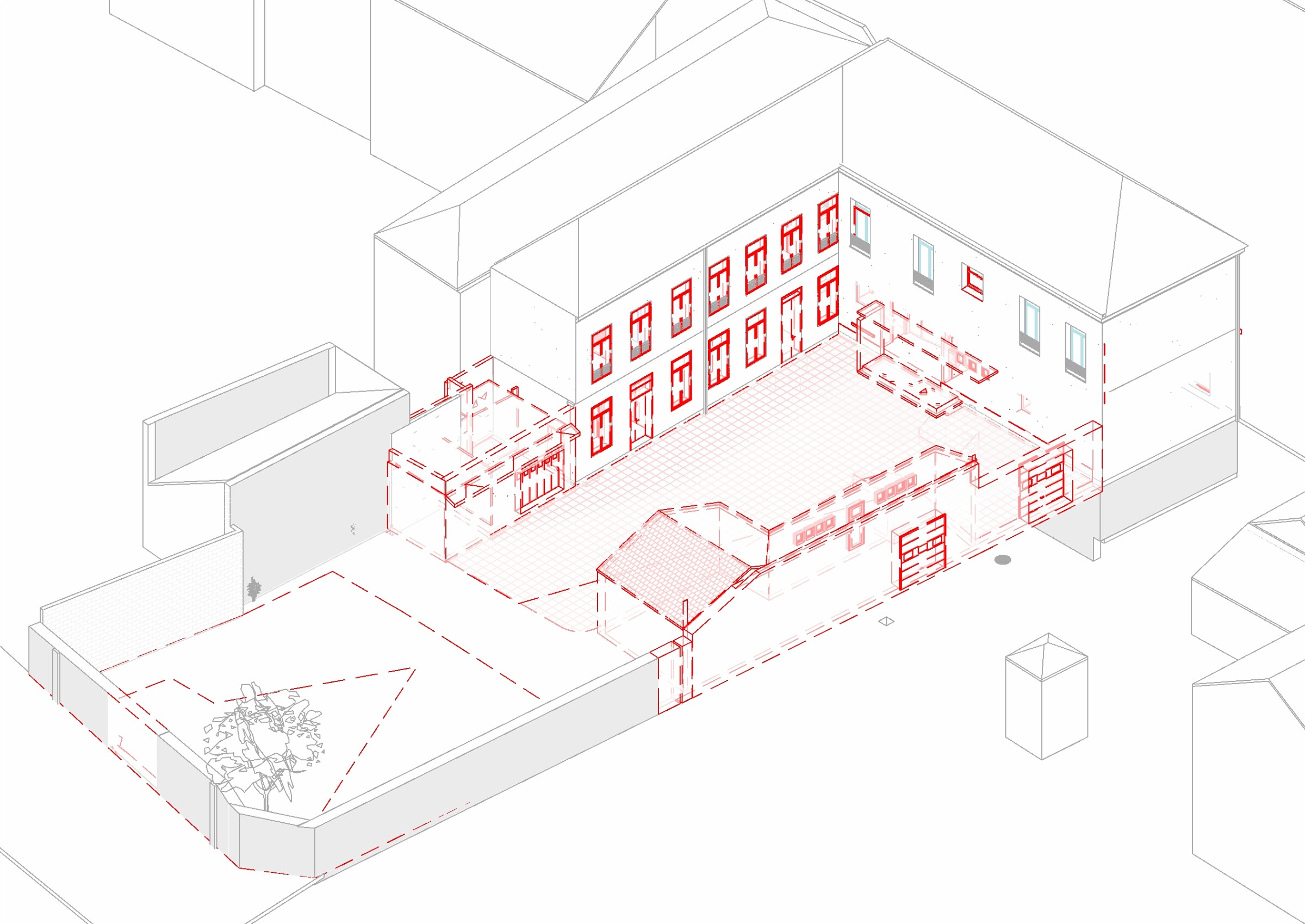 Le bâtiment est accessible depuis l’entrée principale côté rue et par un parking à l’arrière.