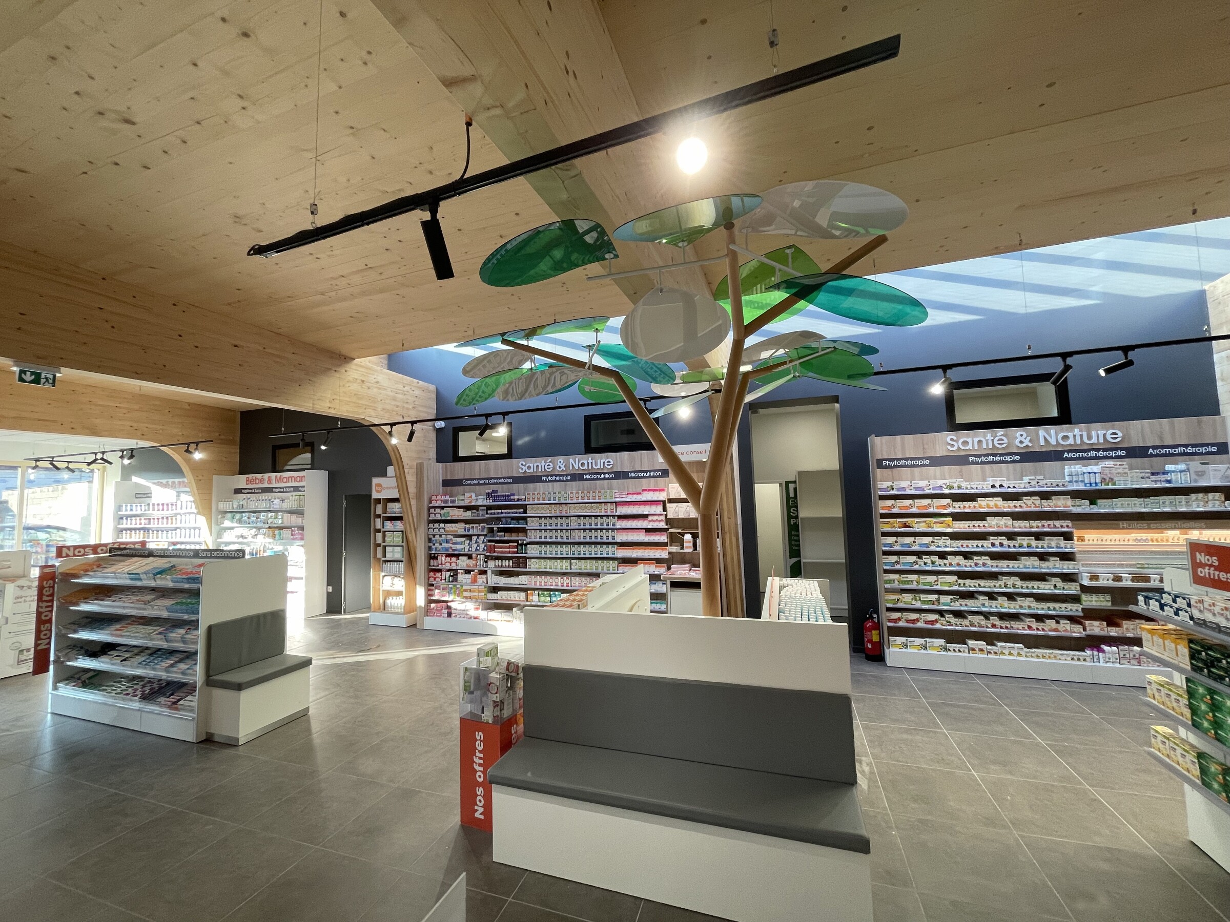 de vente. Afin d’offrir une grande hauteur sous plafond, la charpente bois est laissée brute et les équipements techniques sont dissimulés dans les faux-plafonds des pièces techniques.