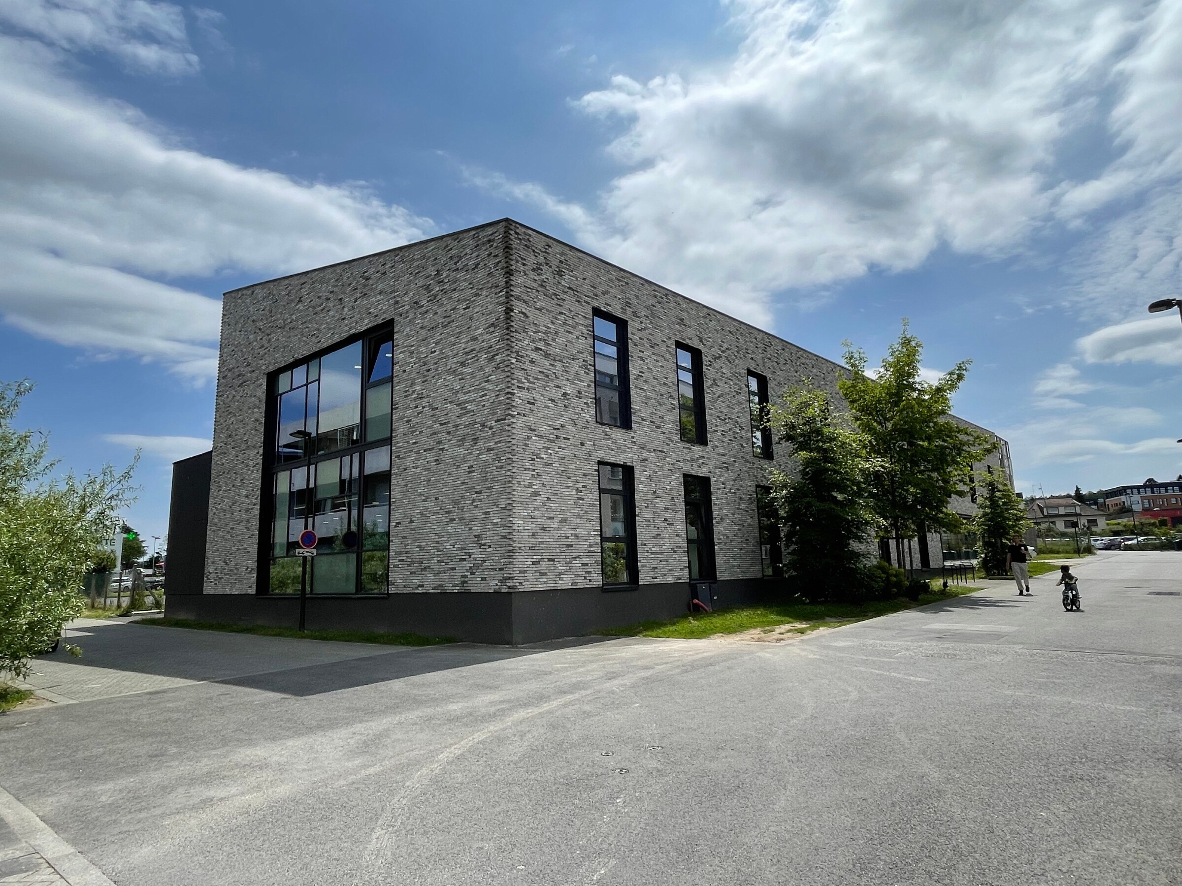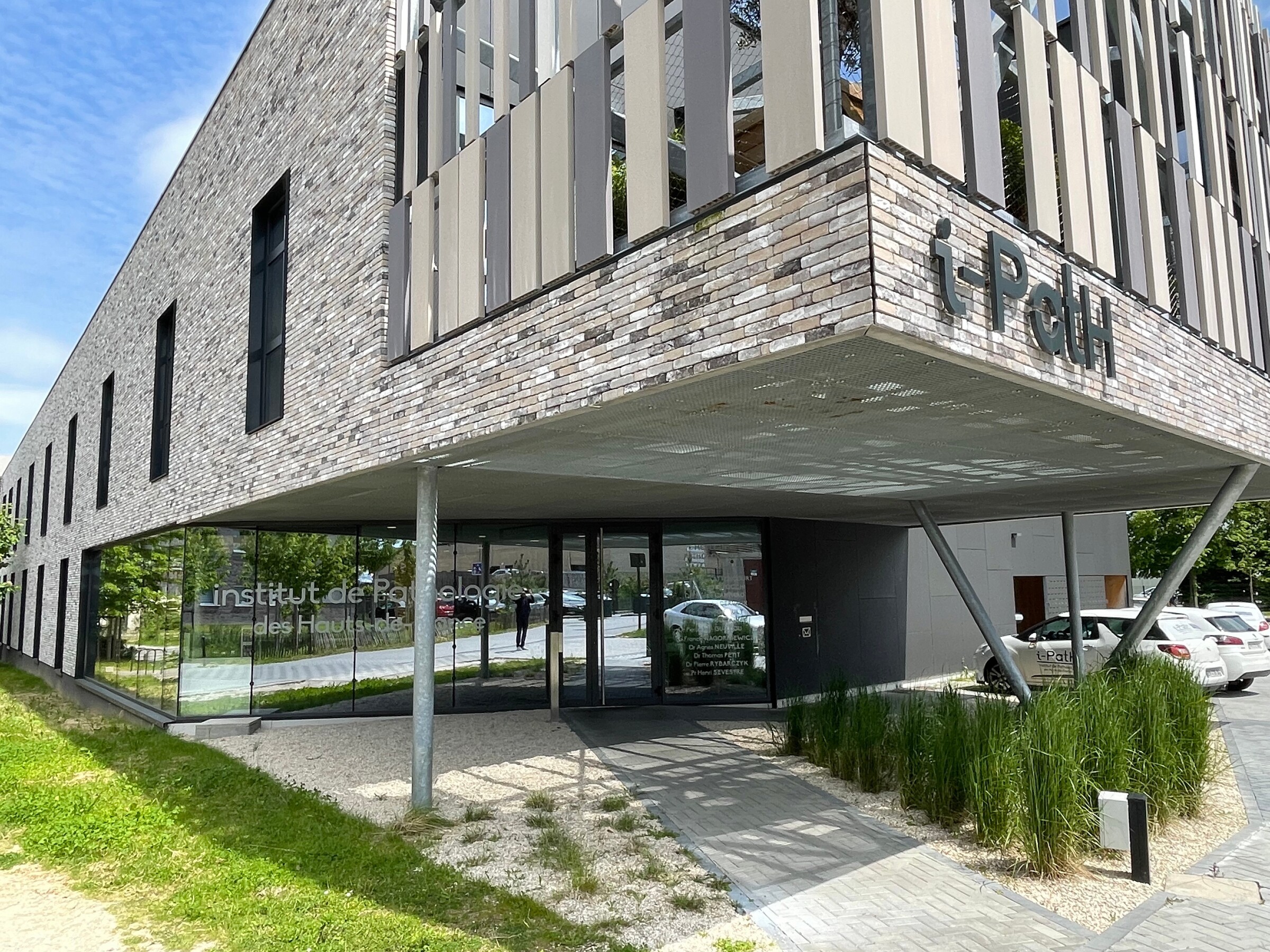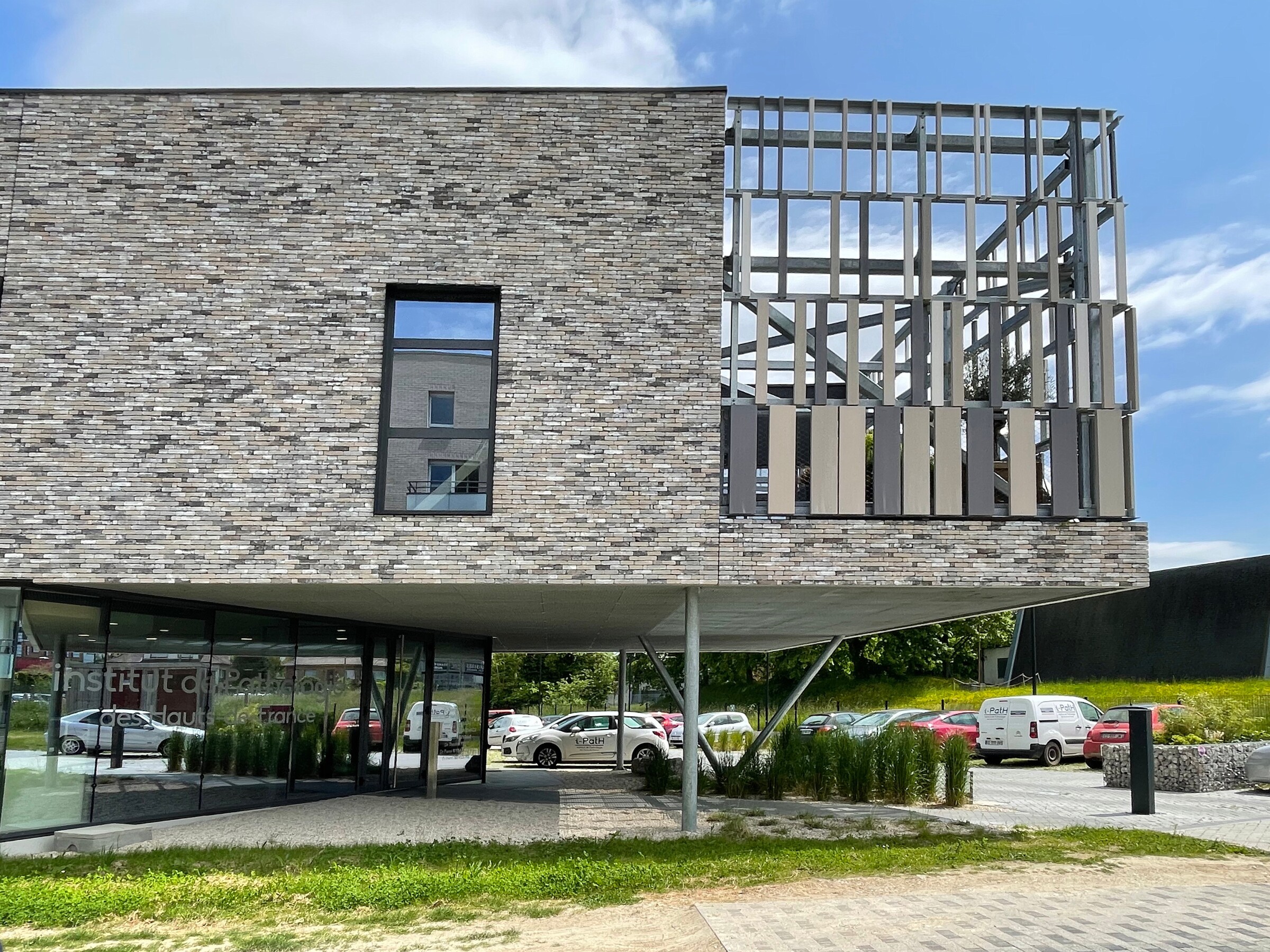 Ce bâtiment contemporain, situé à Amiens, héberge l’Institut de Pathologie des Hauts-de-France. L’architecture se distingue par l’utilisation d’une brique texturée, qui donne une identité forte au projet, combinée à des éléments métalliques fins, notamment sur les façades et le porte-à-faux, qui surplombe l’entrée. L’intégration des ouvertures et des jeux de lumière à travers les balcons et le jardin d’hiver crée un dialogue entre les espaces intérieurs et extérieurs. Le volume global du bâtiment se divise en deux monolithes, renforçant une impression de solidité et de stabilité. À l’arrière, le bâtiment s’étire discrètement pour s’insérer harmonieusement dans le site, tandis que la façade avant capte l’attention avec ses lignes modernes et épurées. Le parking est traité avec des pavés perméables et engazonnés, permettant une intégration paysagère réussie et une continuité avec le quartier environnant. À l’intérieur, le contraste entre la chaleur du bois et les éléments techniques exposés crée une atmosphère à la fois accueillante et fonctionnelle. L’atrium central, baigné de lumière naturelle grâce à une large verrière, devient un point central de circulation et de rencontre. La transparence et les ouvertures sont optimisées, permettant à la lumière d’inonder les espaces tout en favorisant une ventilation naturelle. Chaque détail a été soigneusement pensé pour offrir aux usagers un confort maximal. Les espaces sont conçus avec une attention particulière aux finitions, notamment dans les choix de mobilier sur mesure et d’aménagements intégrés. L’ensemble du projet reflète une conception durable, aussi bien dans le choix des matériaux que dans les solutions énergétiques mises en œuvre, favorisant ainsi une approche responsable de l’architecture.